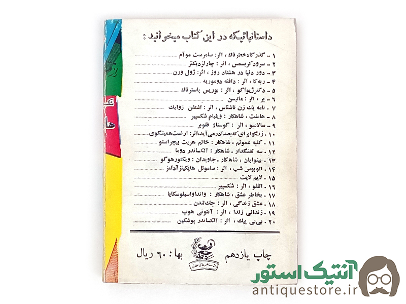 کتاب شامل داستانهای گذرگاه خطرناک ، سرود کریسمس ، دور دنیا در هشتاد روز ، ربه کا ، دکتر ژیواگو ، پر ، نامه یک زن ناشناس ، هاملت ، سالامبو ، زنگها برای که به صدا در می آیند ، کلبه عمو تم ، سه تفنگدار ، بینوایان ، اتوبوس شب ، لایم لایت ، اتللو ، بخاطر عشق ، زندگی زندا و بی بی پیک می باشد .