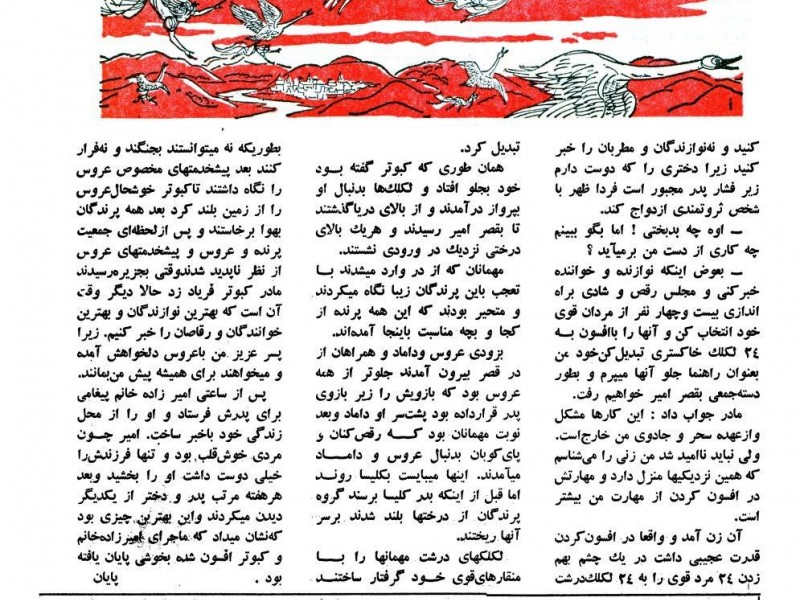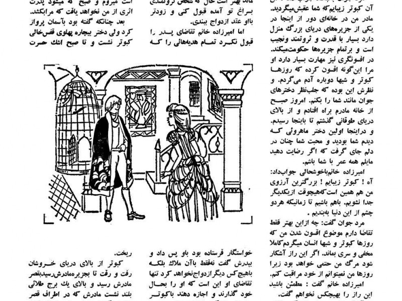 بعد چنانکه گفته بود به آسمان پرواز کرد ولی دختر بیچاره پهلوی قفس خالی کبوتر نشست و تا صبح اشک حسرت ریخت.