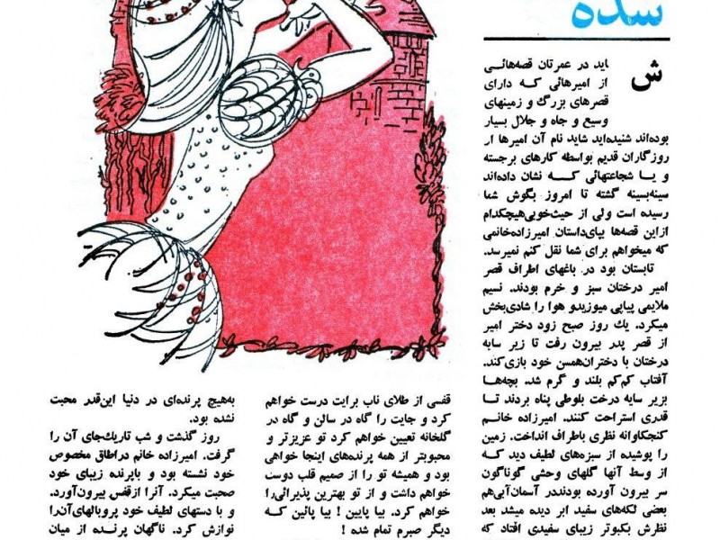 روز گذشت و شب تاریک جای آن را گرفت. امیرزاده خانم در اطاق مخصوص خود نشسته بود و با پرنده زیبای خود صحبت میکرد. آنرا از قفس بیرون آورد و با دستهای لطیف خود پر و بالهای آن را نوازش کرد. ناگهان پرنده از میان دستهایش به بیرون پرید و ناپدید شد. هرچه به اطراف نگاه کرد ببیند به کجا پریده اثری از آن ندیده اما با تعجب پس از لحظهای جوان خوش قدوقامتی را دید که پهلوی قفس ایستاده است.